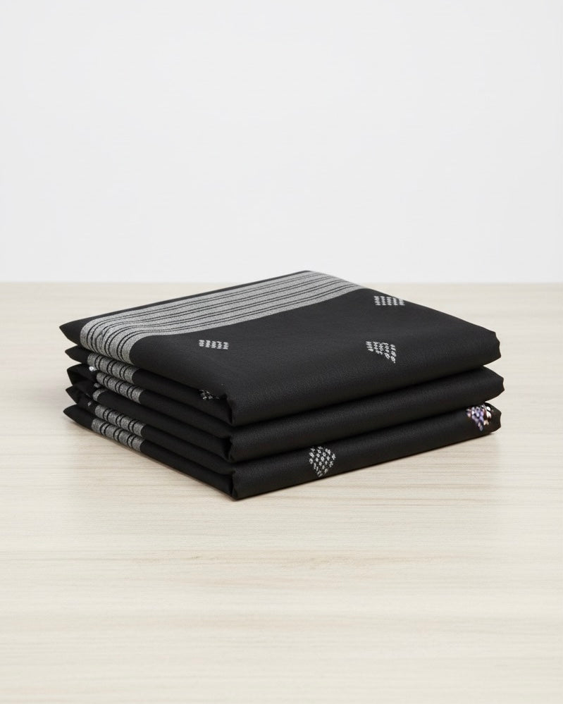 Elegant Black Saree with White Geometric Motifs and Striped Pallu with blouse